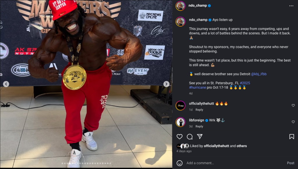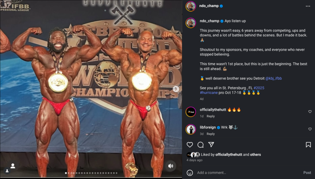 Recently, Ndo Champ competed at the 2025 IFBB Masters World Bodybuilding (40+) event in New Jersey, where he powered through his return to the stage after six years and claimed an impressive 2nd place finish Instagram+1. This performance is especially significant—it marks his debut in an IFBB professional league after six years away Instagram.